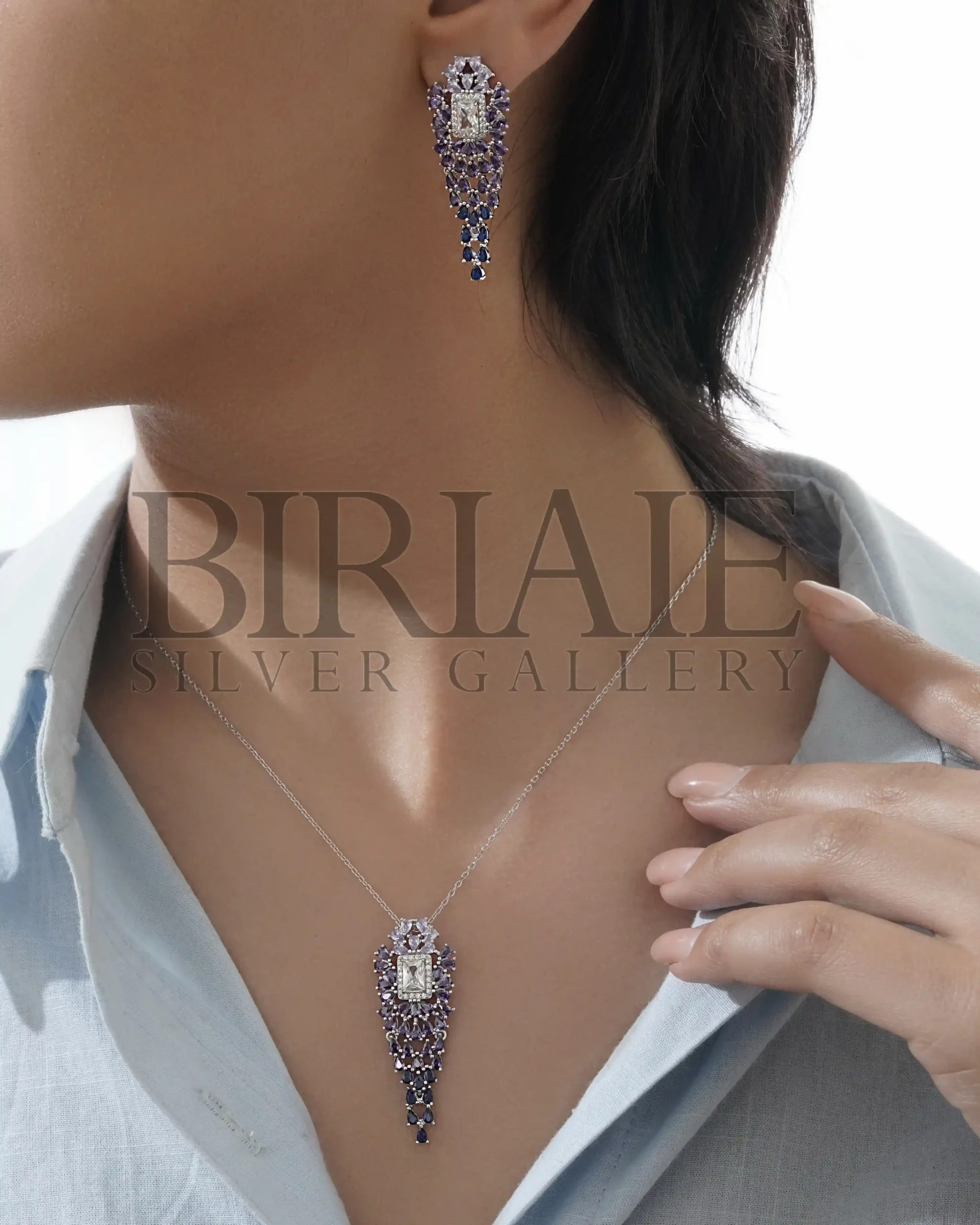 نیم ست نقره نگین رنگی، با عیار 925 نقره ساخته شده است. ست نقره نگین دار دارای آبکاری رودیوم می باشد و رنگ ثابت است. گردنبند زنانه به همراه زنجیر ارایه میگردد.